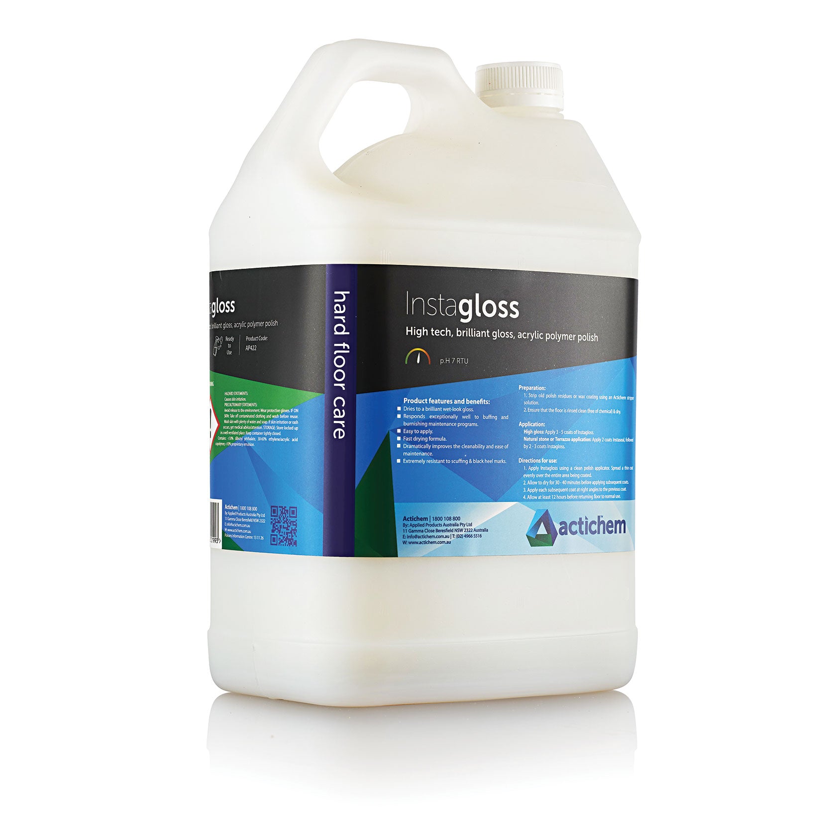 Instagloss is a new generation floor finish with the perfect blend of durability and hardness for traffic, black heel mark resistance and wet look reparability. Being easy to apply and drying to an instant brilliant gloss, makes it ideal for use in institutions, medical facilities, offices, homes, retail outlets and similar facilities. Instagloss has outstanding leveling properties and can be used as a single step finish thus eliminating the need for a base sealer. Instagloss contains a high solids content which builds quickly allowing the applicator to apply fewer coats to achieve the required gloss and protection.