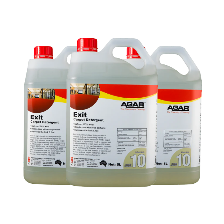 EXIT leaves the carpet with a good “hand” and improves carpet appearance with brighter colours. The perfume in EXIT dispels “wet carpet” odours and leaves a lingering fresh rose fragrance.