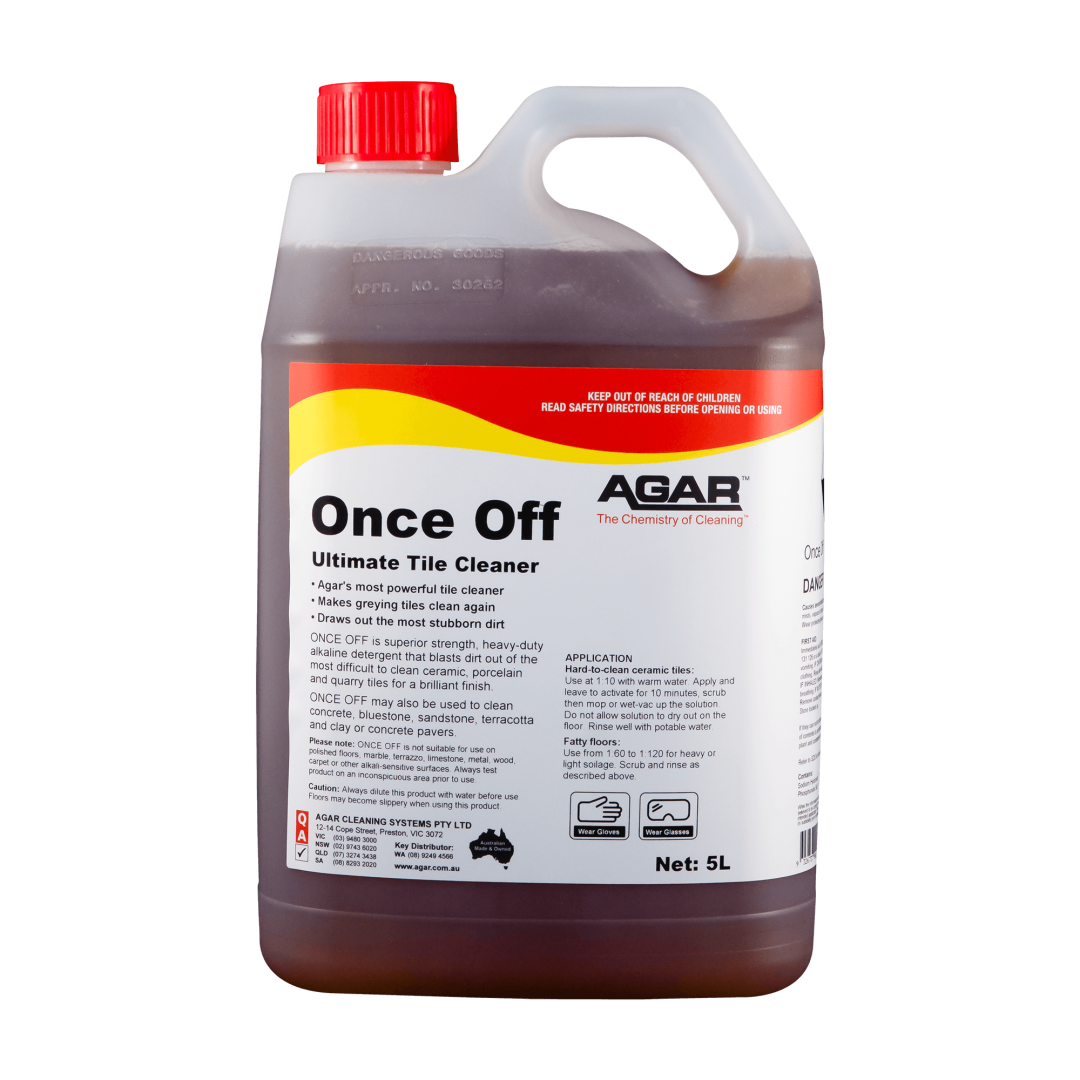 ONCE OFF is a very concentrated, highly alkaline tile cleaner with water-softening and degreasing properties.
