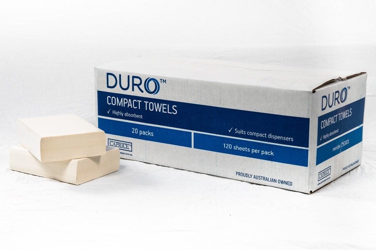 The Duro compact interleaved towel is an absorbent and dependable option for the healthcare, hospitality and cleaning industries. Like all products in the Duro range, it’s made with care from quality materials for superior reliability. The compact design makes this paper towel ideal for use in confined washrooms, and it’s compatible with our DCT dispenser for extra convenience.